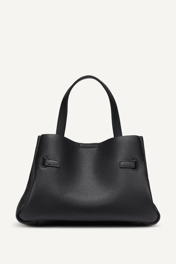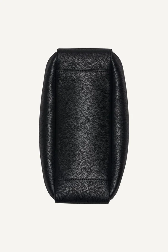 El epítome de lo esencial: este bolso satchel pequeño te permite llevar tu cartera, llaves y teléfono sin que pese sobre una gabardina de varias capas sobre un look de mezclilla de pies a cabeza.