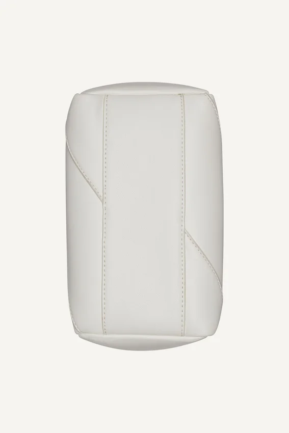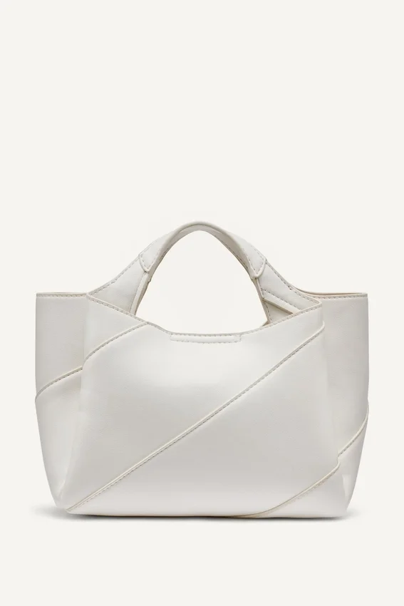 Pequeño pero poderoso: este bolso tipo cartera con bloques de color le da dimensión a un conjunto de blusa acanalada y falda sin tirantes.