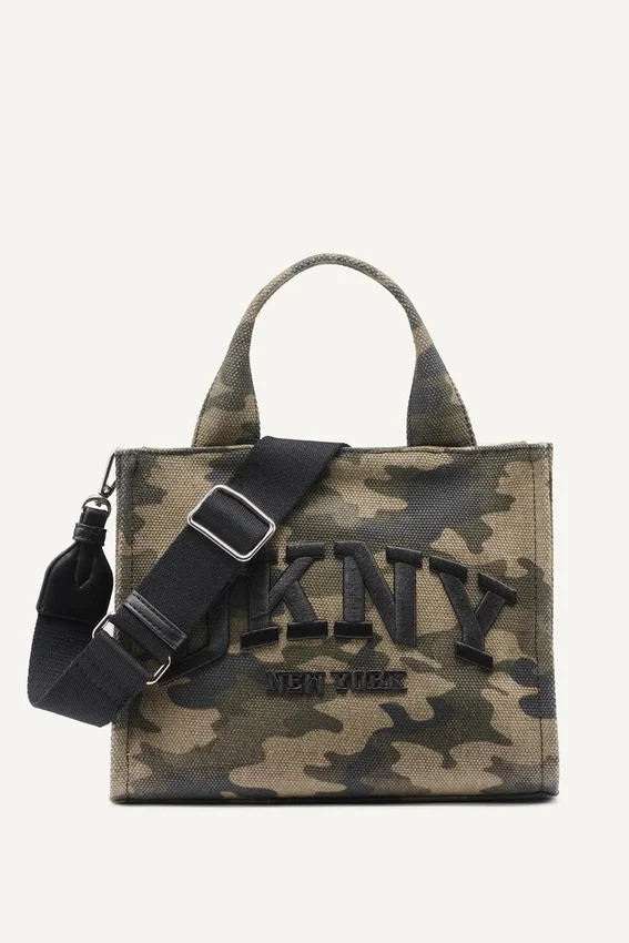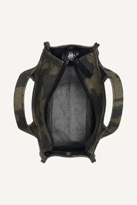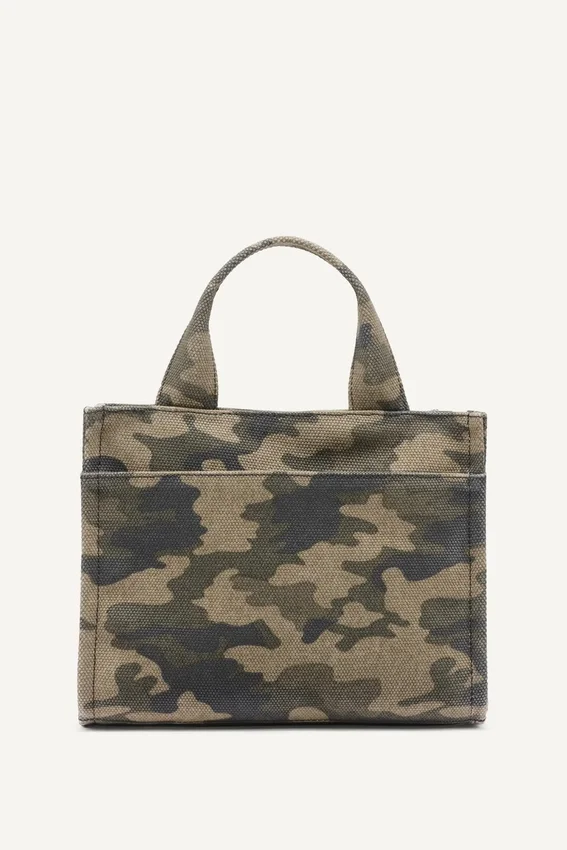Bolso Tote pequeño Hadlee con estampado de camuflaje y logotipo bordado; herrajes plateados; bolsillo trasero exterior sin forro; correa para el hombro de malla, desmontable y ajustable; dos asas superiores de imitación de cuero; cierre superior con cremallera; lona de algodón gruesa: parte principal: 100 % algodón; ribete de imitación de cuero: 100 % poliuretano; limpiar las manchas con un paño suave y húmedo; secar al aire y
