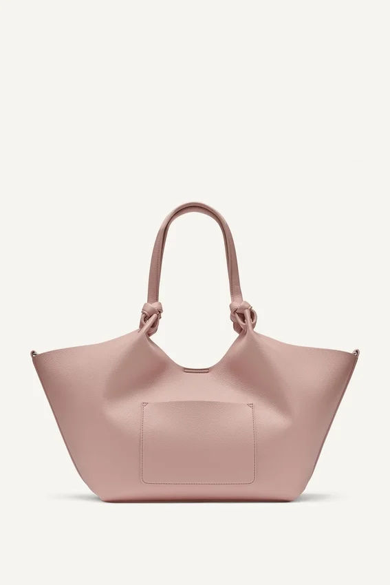 • Bolsillo exterior trasero; dos asas superiores anudadas; cierre magnético con lengüeta
