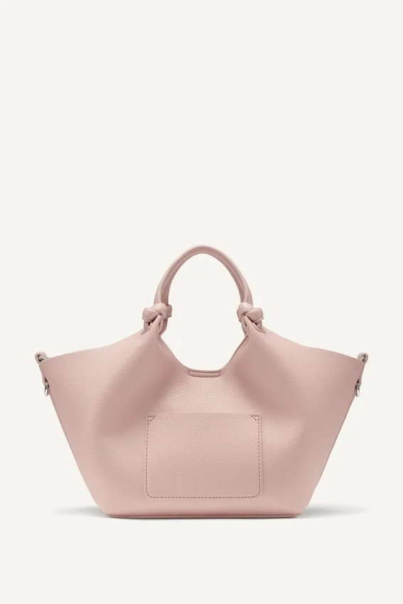 • Bolsillo exterior trasero; correa para el hombro ajustable; dos asas superiores anudadas; cierre con lengüeta magnética