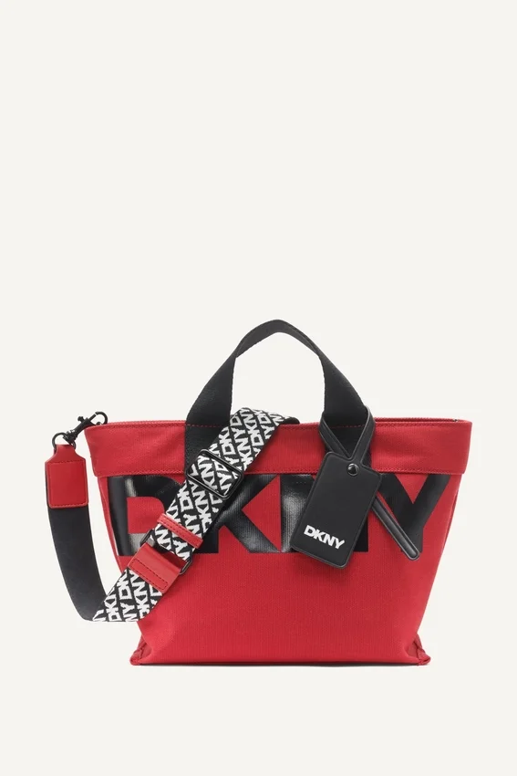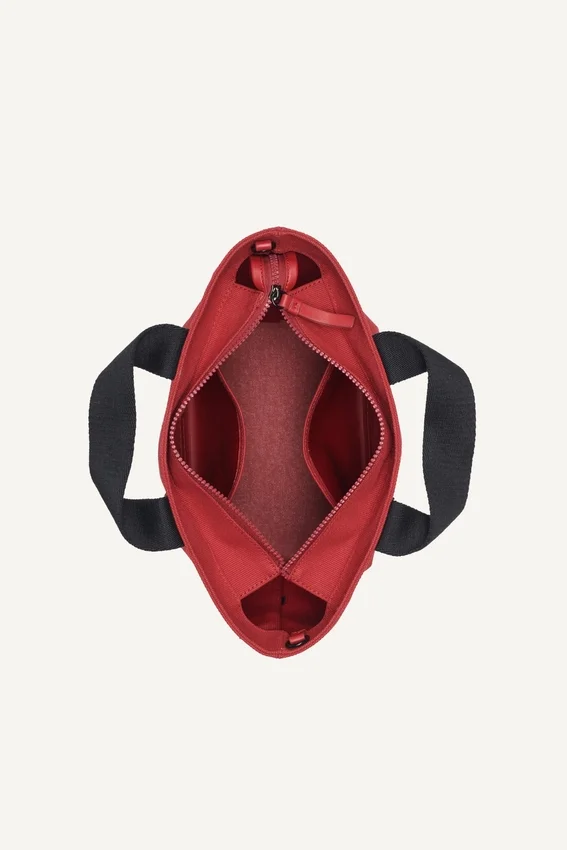 • Correa para el hombro desmontable y ajustable de tejido jacquard con el logotipo; asas superiores dobles; cierre superior con cremallera