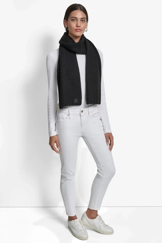 Mantente abrigado con el estilo atemporal de DKNY con esta bufanda de punto acanalado con costuras Shaker. Su tejido texturizado le da un toque acogedor, perfecto para combinar con tus prendas favoritas para el frío.