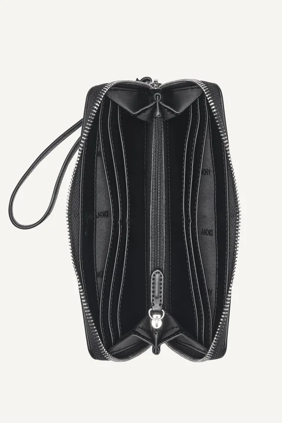 Un básico compacto diseñado para facilitar el día a día, esta cartera con cierre perimetral mantiene organizadas tus tarjetas, dinero en efectivo y pequeños objetos esenciales. Acabada con un bolso de muñeca desmontable para llevarla cómodamente a cualquier parte.