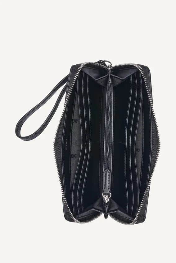 • Cartera espaciosa con cremallera alrededor y correa de muñeca desmontable