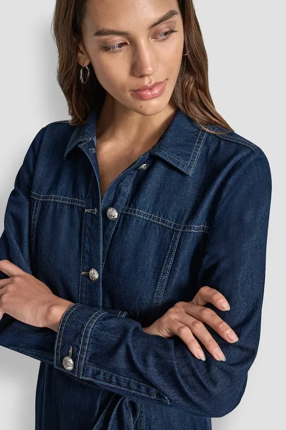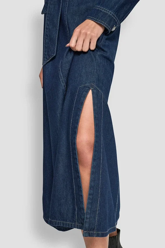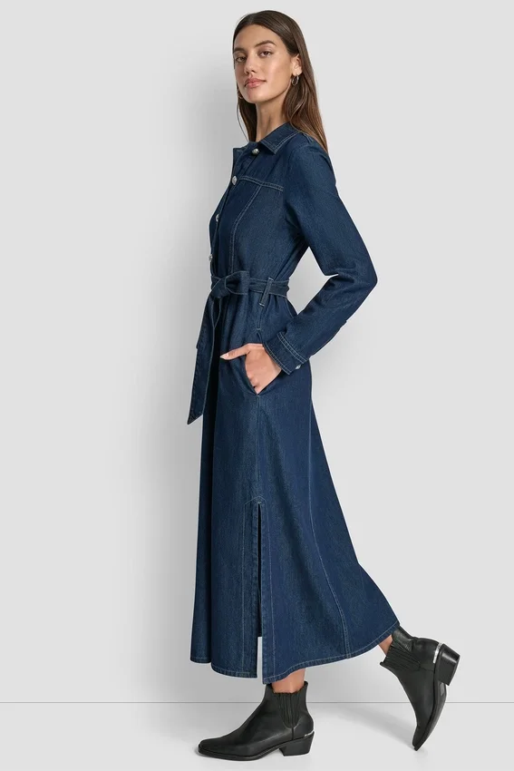 Un vestido Maxi de mezclilla de corte holgado diseñado con un cinturón del mismo tejido extraíble para personalizar la silueta. Con escotes y aberturas laterales, ofrece un estilo sencillo y cotidiano con una silueta limpia y moderna.