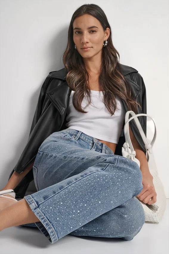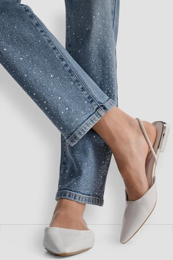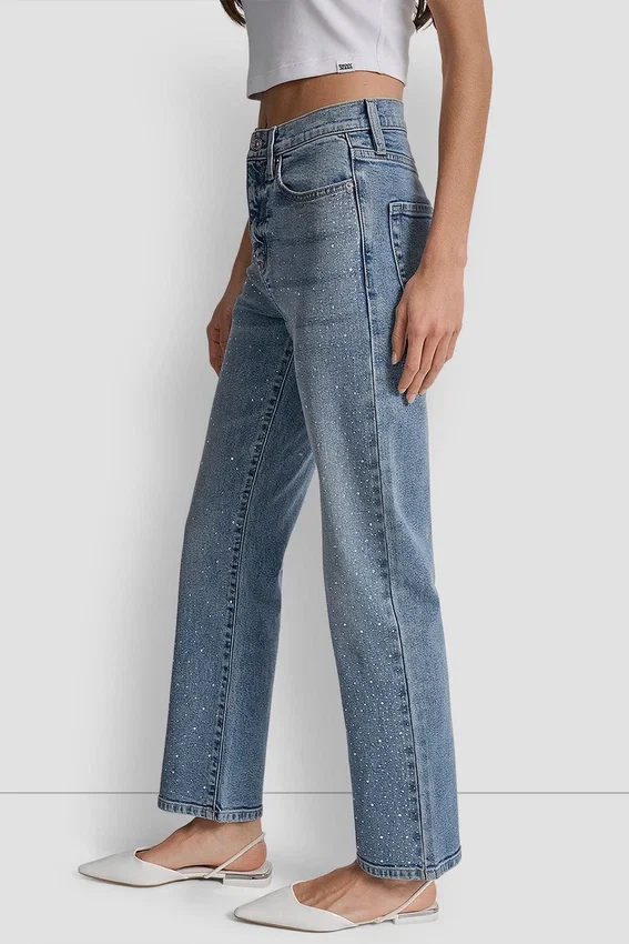 Una silueta clásica con un toque de brillo incorporado. Estos vaqueros de talle alto y pierna recta combinan la comodidad del denim para el día a día con pedrería dispersa que refleja la luz en la medida justa.