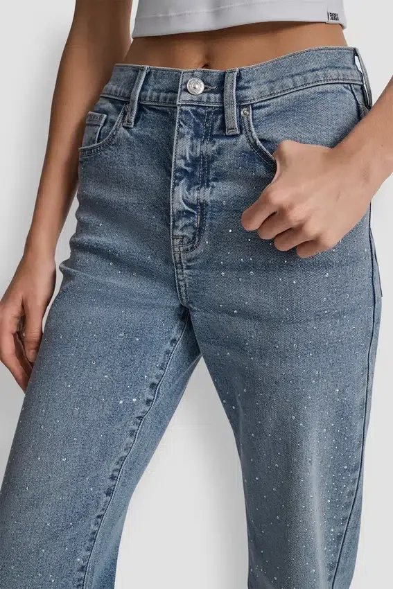• Vaqueros clásicos de talle alto y pierna recta con detalles de pedrería dispersa