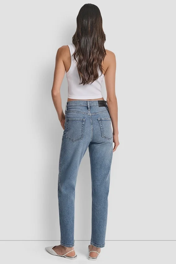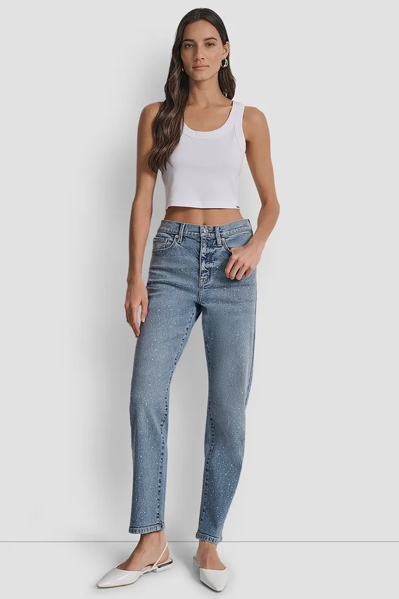 Vaqueros clásicos de talle alto y pierna recta con detalles de pedrería dispersa. Denim de lavado medio para un look atemporal que se puede usar en cualquier lugar. Denim de algodón estructurado con un toque de elasticidad para mayor comodidad. Cierre con cremallera y botones. Diseño de cinco bolsillos. Pierna recta con una línea limpia y favorecedora. Composición del tejido: 99 % algodón, 1 % spandex. Cuidados: Lavar