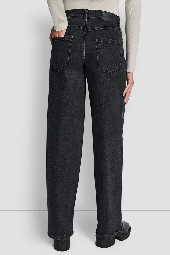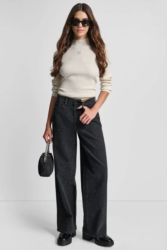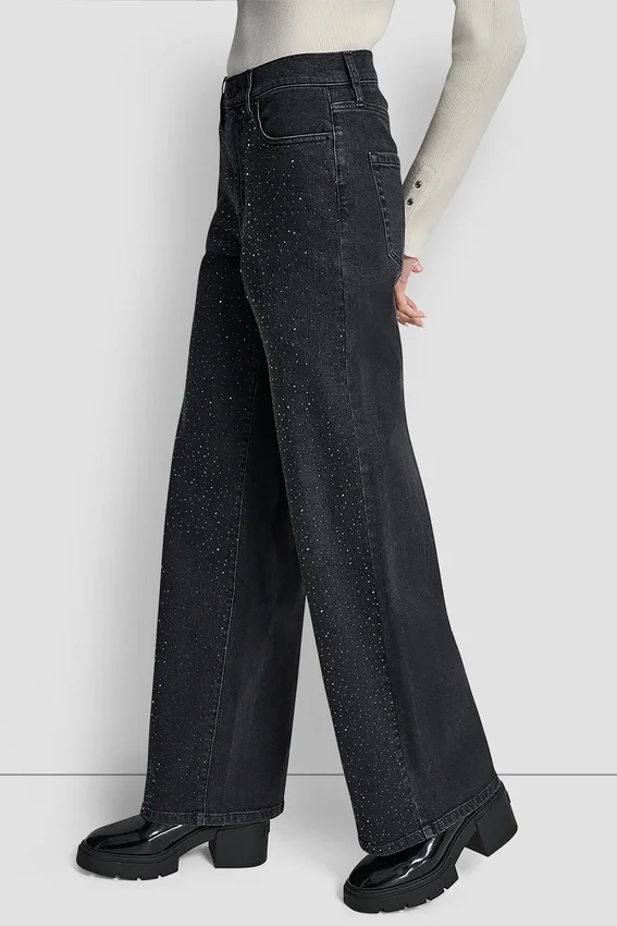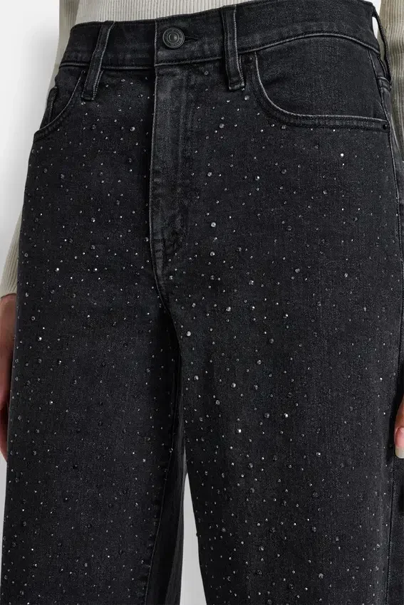Añade un toque inesperado de brillo a tu look con estos vaqueros relucientes. Adornados con pedrería, este llamativo par de pantalones de pierna ancha está confeccionado en 100 % algodón con cintura de talle alto.