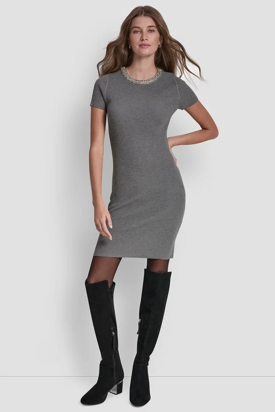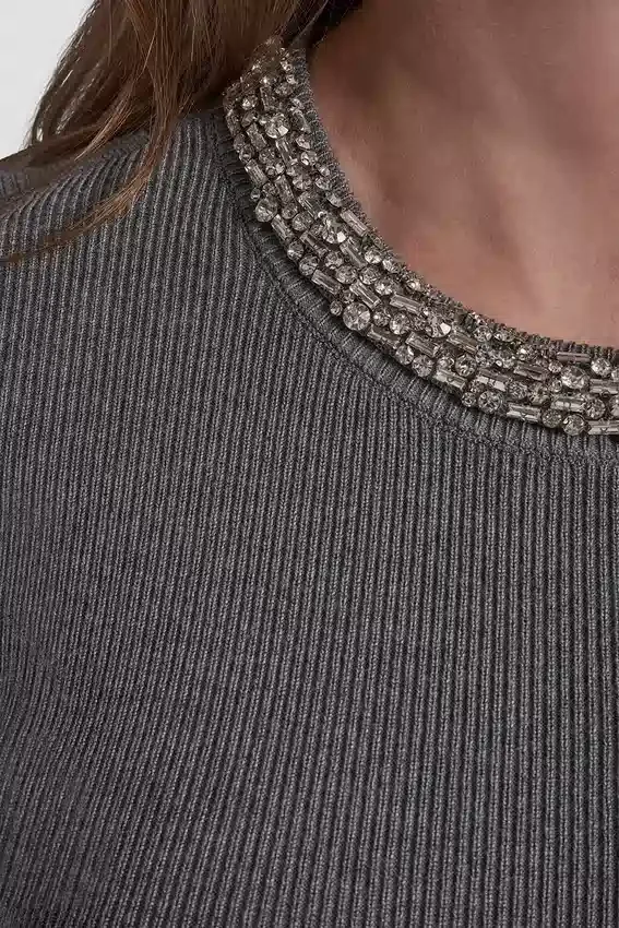 Un minivestido elegante que se ajusta al cuerpo con un acabado pulido. Este modelo de cuello redondo y mangas cortas cuenta con adornos de pedrería brillante en los escotes para un brillo sofisticado y discreto. El tejido acanalado suave y la silueta limpia lo convierten en una prenda fácil de llevar tanto de día como de noche.