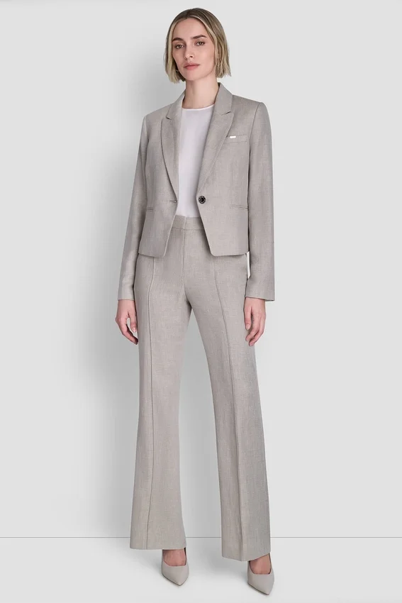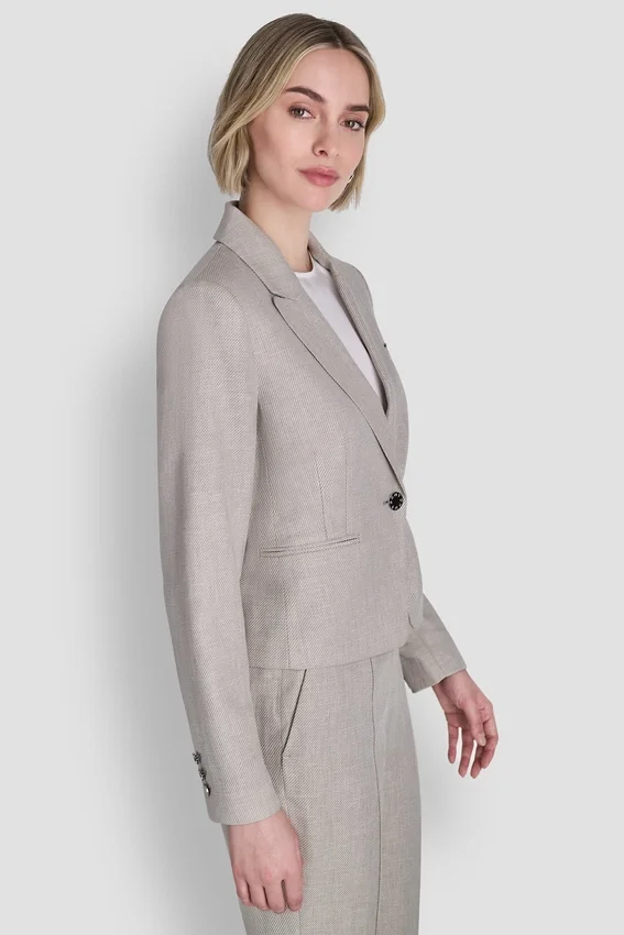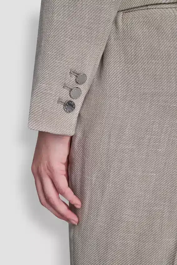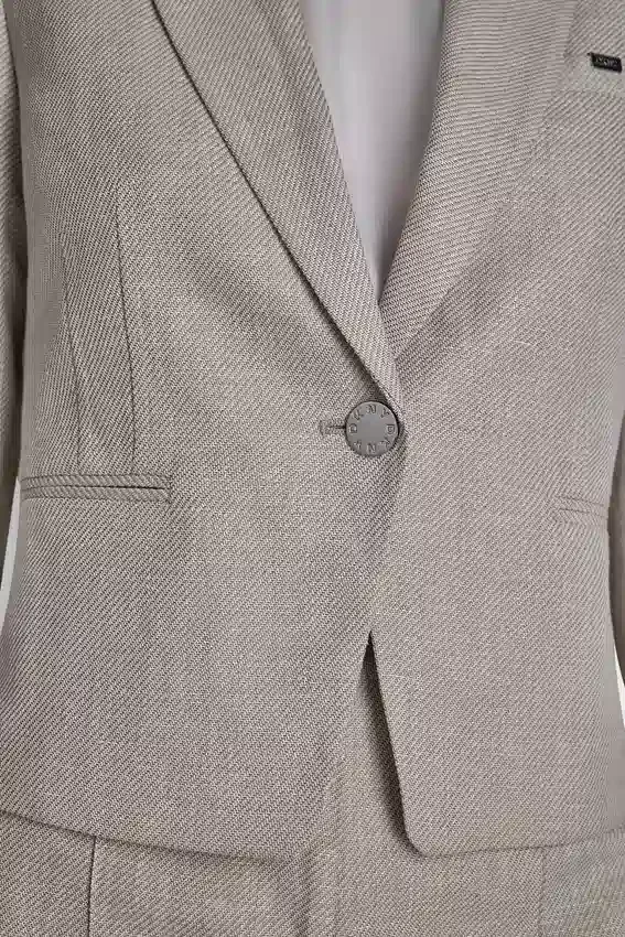 Silueta de un solo pecho, solapas en V, cierre frontal con un botón, mangas largas, bolsillos con solapa, corte estructurado, tejido de sarga Twiggy, 62 % poliéster reciclado, 24 % lino, 14 % rayón viscosa, solo limpieza en seco, importado, n.º de estilo: Ub6Jx476