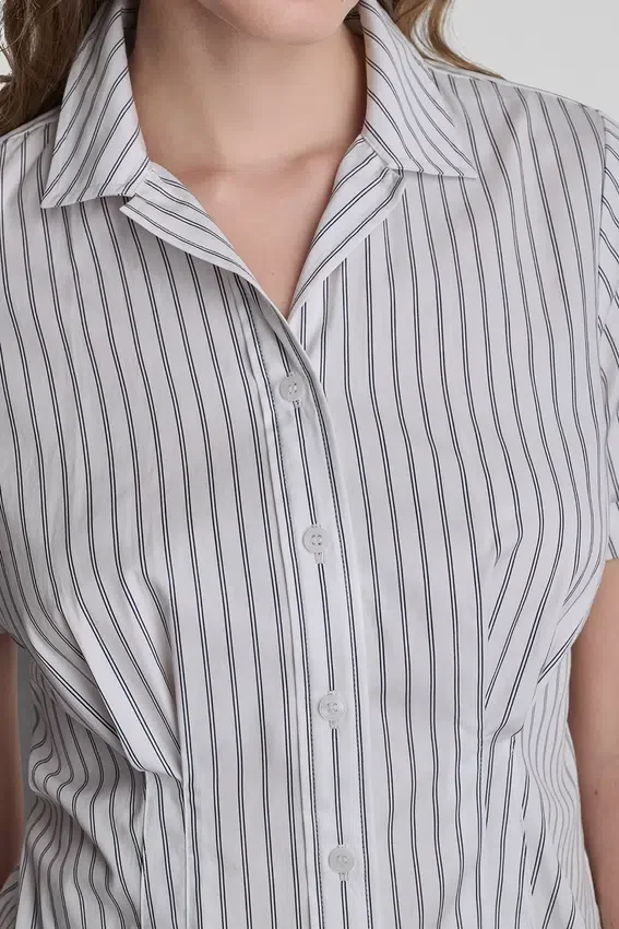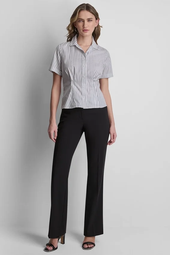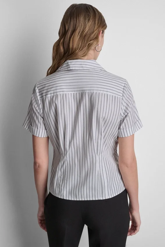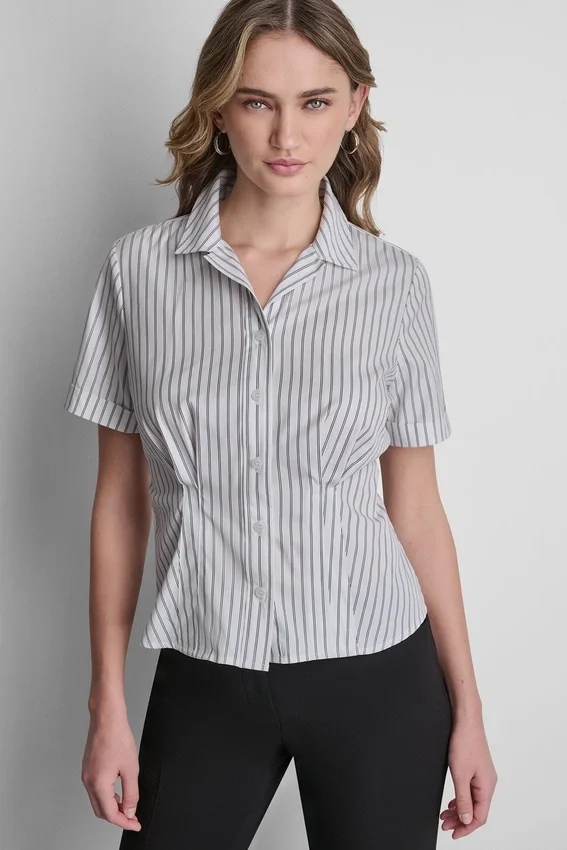 Fresca y elegante, esta blusa tejida está confeccionada en una mezcla de algodón elástico para mayor comodidad y estructura. Diseñada con una silueta entallada, ofrece una versatilidad sin esfuerzo para el trabajo o el estilo cotidiano.