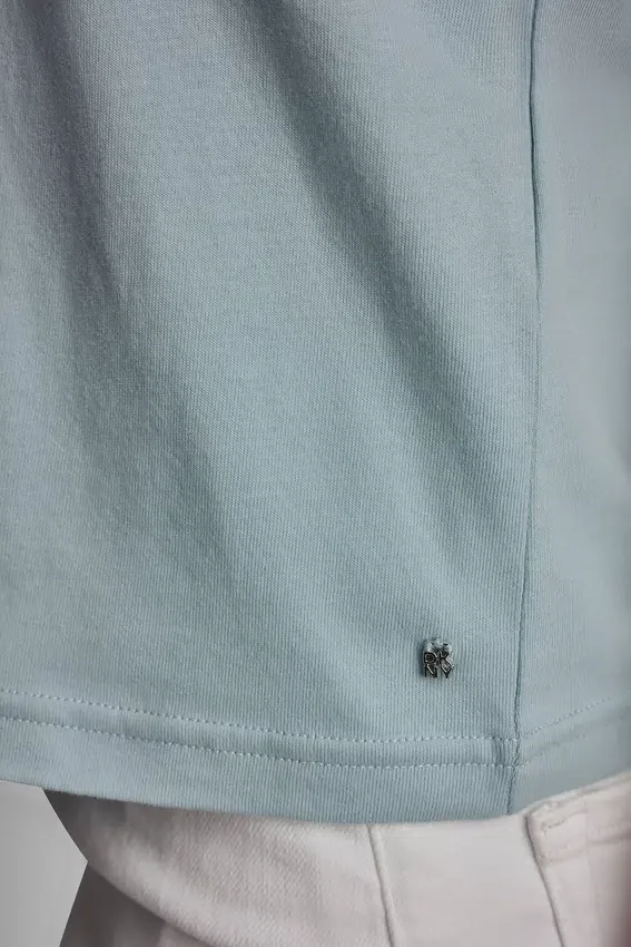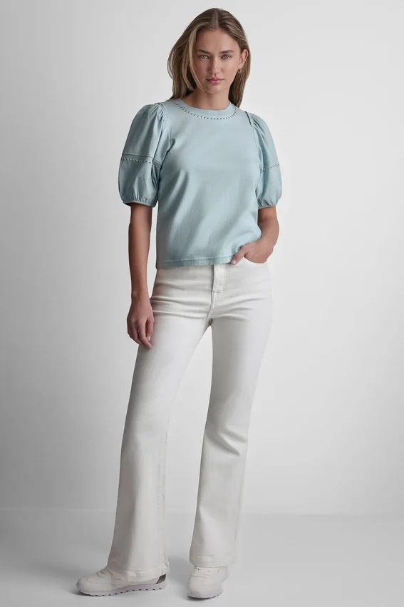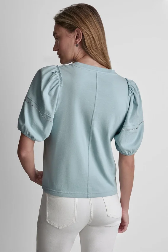 Con un toque de brillo sutil, esta camiseta de cuello redondo cuenta con detalles de tachuelas abombadas y mangas abullonadas con mini volantes para un acabado femenino. Confeccionada en algodón suave con un corte regular, es una prenda llamativa y fácil de combinar para el estilo diario.