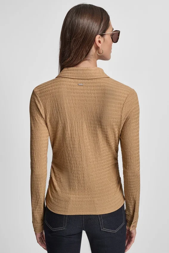 Camisa de manga larga con cuello en V y cuello en punta. Cierre con botones. Sin forro. Encaje ondulado: 99 % poliéster, 1 % elastano (spandex). Lavar a máquina en frío; no limpiar en seco ni usar lejía; secar en horizontal. Importada. N.º de estilo: Dj5T1385