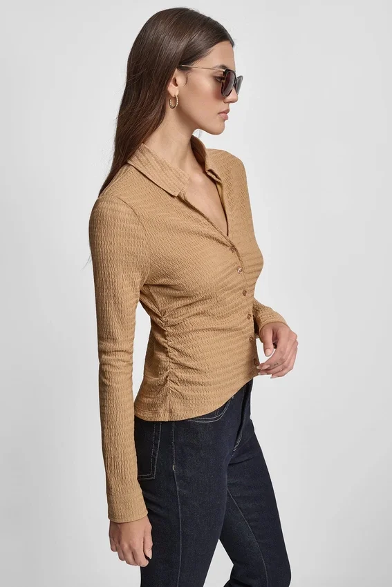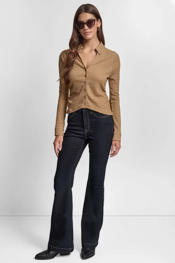 Con botones bajos para dejar ver un poco de piel, esta camisa ajustada es el complemento perfecto para unos vaqueros.