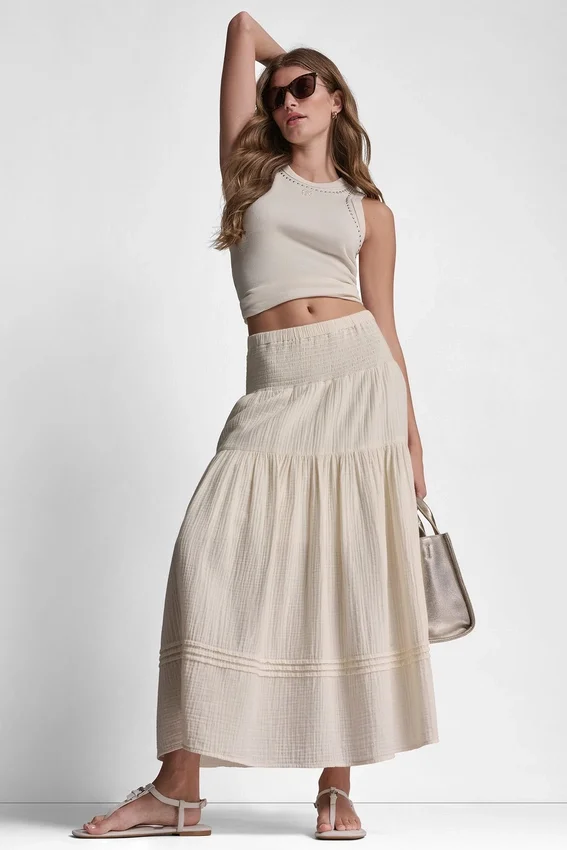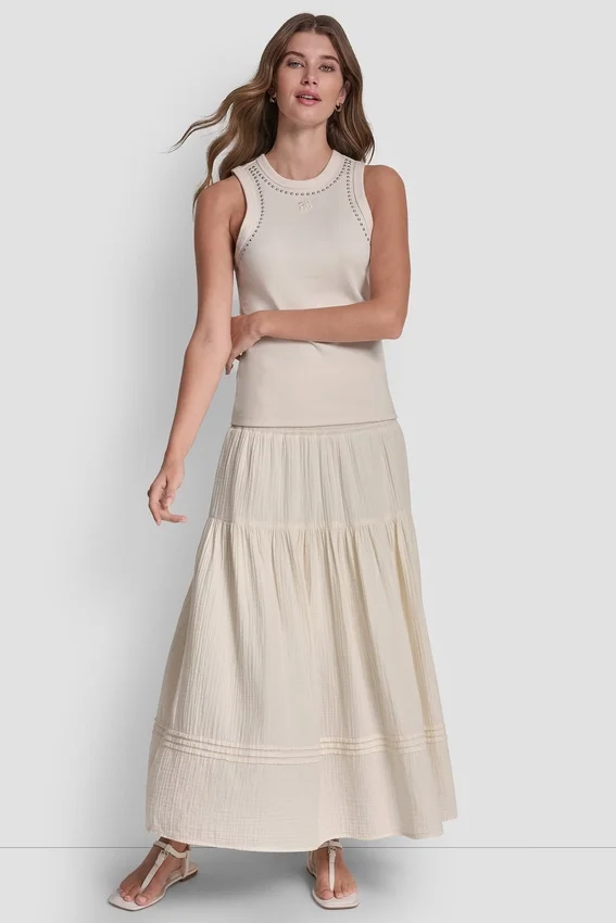Una prenda básica moderna con un toque sutil, esta camiseta de tirantes sin mangas de corte ajustado está adornada con tachuelas redondeadas en los escotes y las sisas para un look refinado. Confeccionada en un suave tejido de punto de mezcla de algodón con elasticidad añadida, ofrece comodidad durante todo el día con detalles sofisticados.