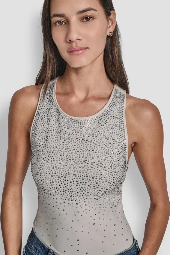 Una camiseta sin mangas elegante y de corte ajustado, decorada con un diseño de pedrería en degradado para darle un toque sofisticado al brillo de todos los días. lavar del revés con colores similares, ciclo suave, usar solo blanqueador sin cloro, sacar de inmediato, secar en plano, planchar a baja temperatura si es necesario, no lavar en seco.