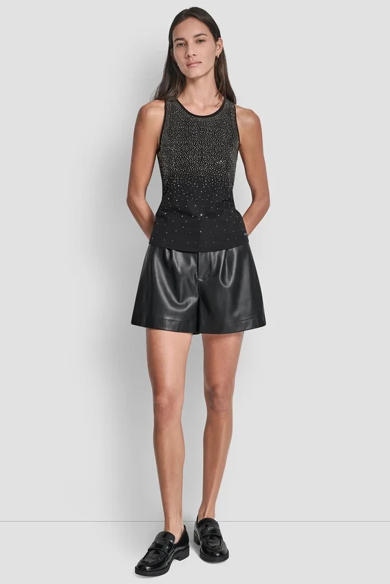 Una camiseta sin mangas elegante y de corte ajustado, decorada con un diseño de pedrería en degradado para darle un toque sofisticado al brillo de todos los días. lavar del revés con colores similares, ciclo suave, usar solo blanqueador sin cloro, sacar de inmediato, secar en plano, planchar a baja temperatura si es necesario, no lavar en seco.