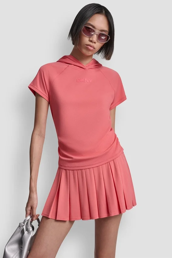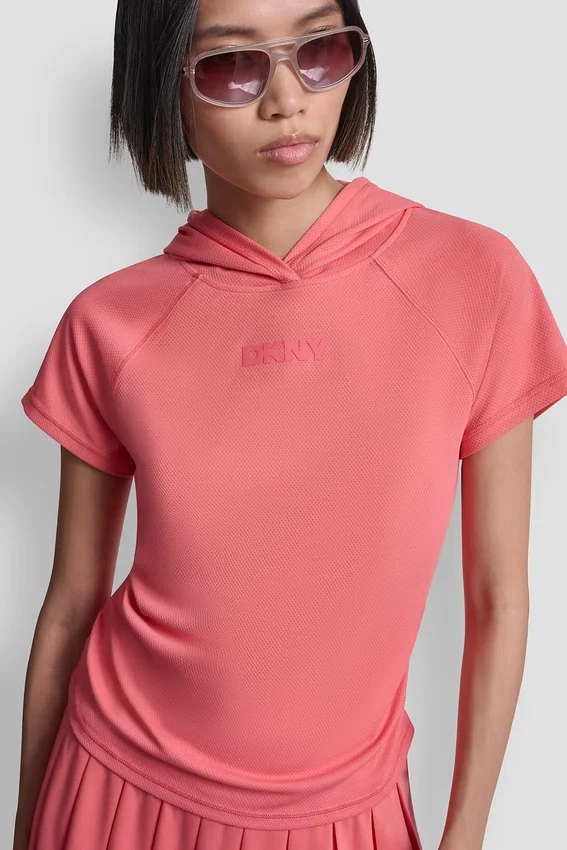 Camiseta con capucha, mangas raglán cortas y adornos de silicona, con costuras planas. Sin forro. Jersey de malla técnica: 100 % poliéster. Lavar a máquina en frío del revés; no usar lejía ni suavizante; secar en secadora a baja temperatura y retirar inmediatamente. Importada. N.º de estilo: Dp6T1585