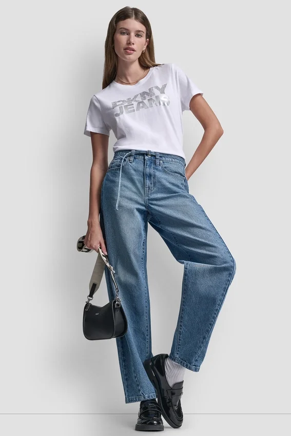 Atrevida y llamativa, esta camiseta de cuello redondo presenta el logotipo de DKNY Vaqueros apilado con detalles de pedrería y lámina para un brillo adicional.
