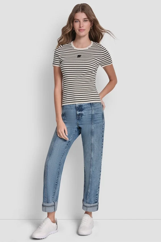 Cuello redondo, mangas cortas, corte ajustado, patrón acanalado y rayado, estilo jersey, confección de mezcla de algodón; 65 % algodón, 35 % nailon. Lavar a mano en agua fría con colores similares, del revés; usar solo blanqueador sin cloro cuando sea necesario; secar en plano; planchar a baja temperatura si es necesario. Importado. Estilo n.º: Dj6R0150