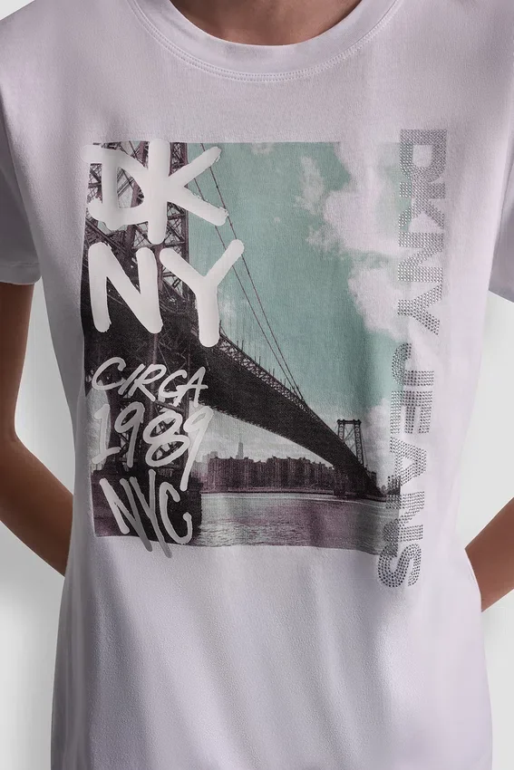 Atrevida y expresiva, esta camiseta de cuello redondo presenta un gráfico fotorrealista de DKNY Williamsburg con detalles de grafitis de pedrería para un brillo adicional. Confeccionada en una suave mezcla de algodón y modal, ofrece comodidad para el día a día con un estilo llamativo.