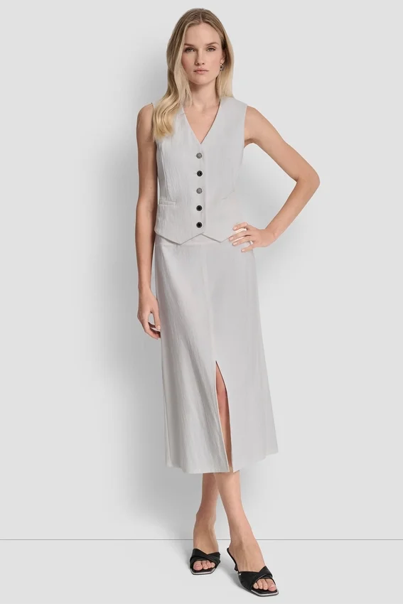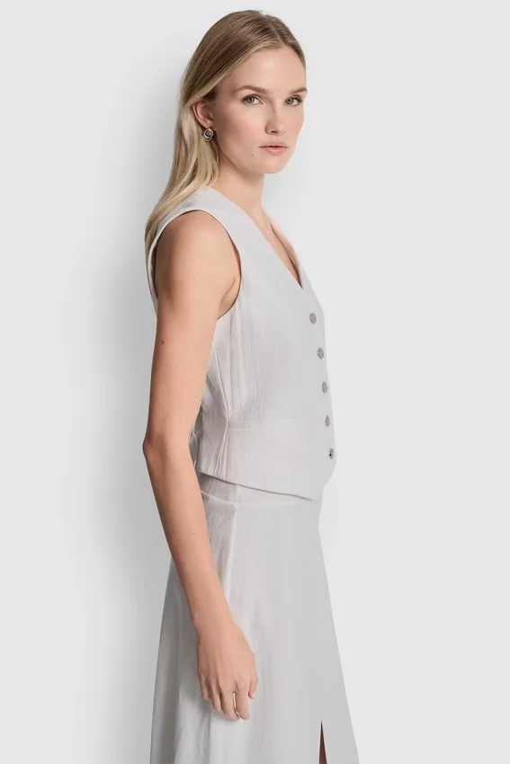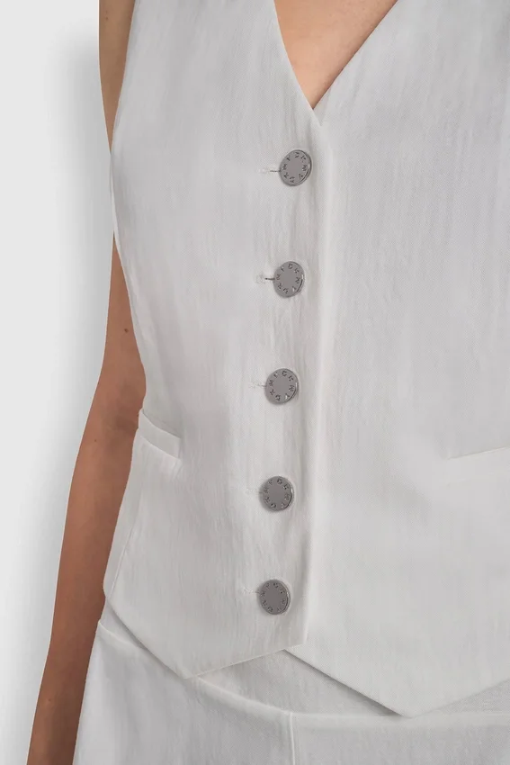 Chaleco sin mangas con cuello en V, cierre frontal con botones con el logotipo, dos bolsillos de ojal en las caderas, forrados. Piqué de mezcla de algodón: 55 % algodón, 38 % nailon, 6 % lino; forro: 100 % poliéster. Limpieza en seco o lavado a máquina en ciclo delicado con agua fría, del revés; no usar lejía; secar colgado. Importado. N.º de estilo: P6Chueqb
