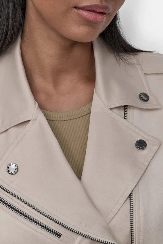 Combina este chaleco motero con un elegante vestido midi para darle un toque urbano a tu ropa de trabajo.