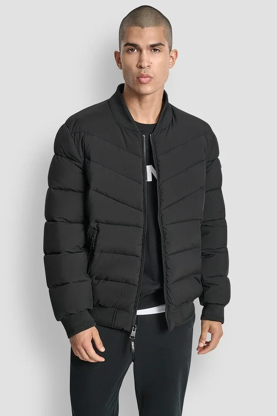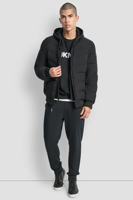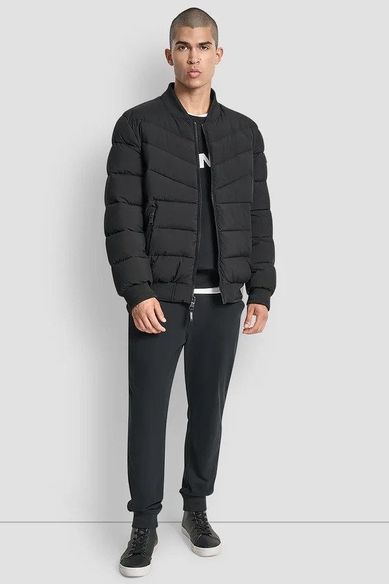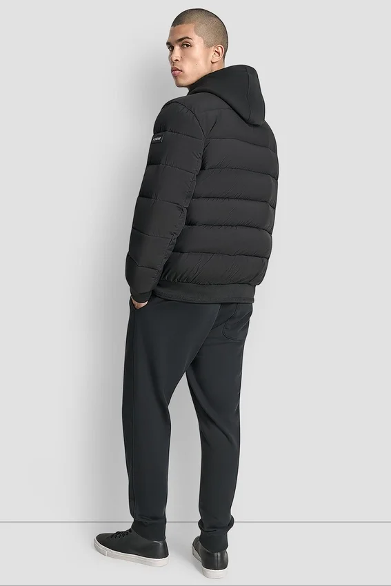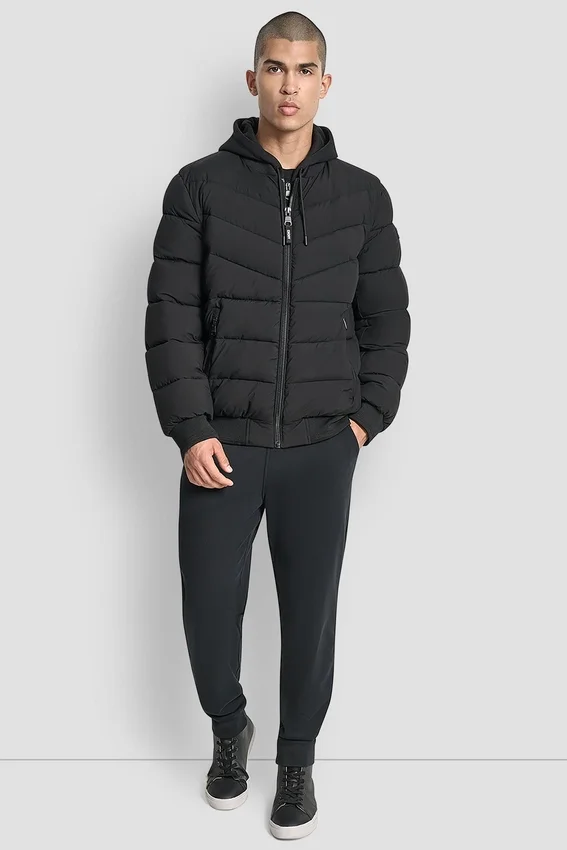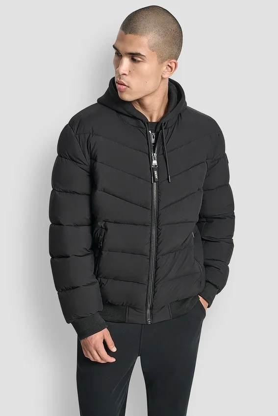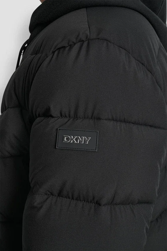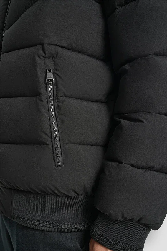 Bomber plumífero elástico con peto con capucha Cierre frontal con cremallera; dobladillos y puños acanalados; detalles de peto con capucha desmontables Exterior: 100 % poliéster con laminado de poliuretano transparente Lavar a máquina en frío por separado, ciclo delicado; usar solo blanqueador sin cloro cuando sea necesario; no usar suavizante; secar en secadora a baja temperatura; planchar a baja temperatura si es necesario Importado
