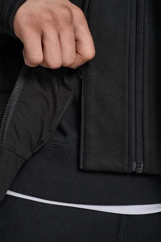 - Cierre frontal con cremallera; dobladillos y puños acanalados; detalles de capucha y peto desmontables