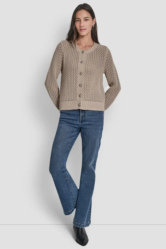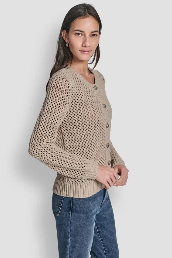 Cierre frontal con botones Sin forro Tejido: 60 % algodón, 40 % acrílico Lavar a máquina en frío con colores similares, solo del revés Usar solo blanqueador sin cloro cuando sea necesario Secar en secadora a baja temperatura; planchar a baja temperatura si es necesario Patrón de costuras abiertas Escotes redondos Mangas largas Importado Estilo n.º: Dj5R0639