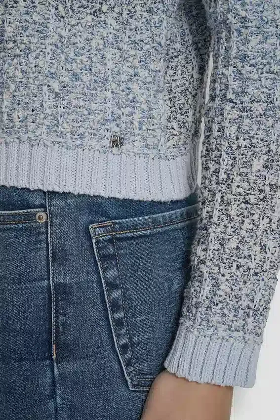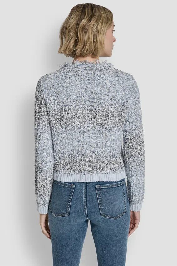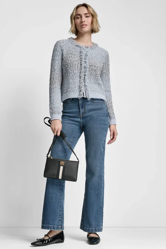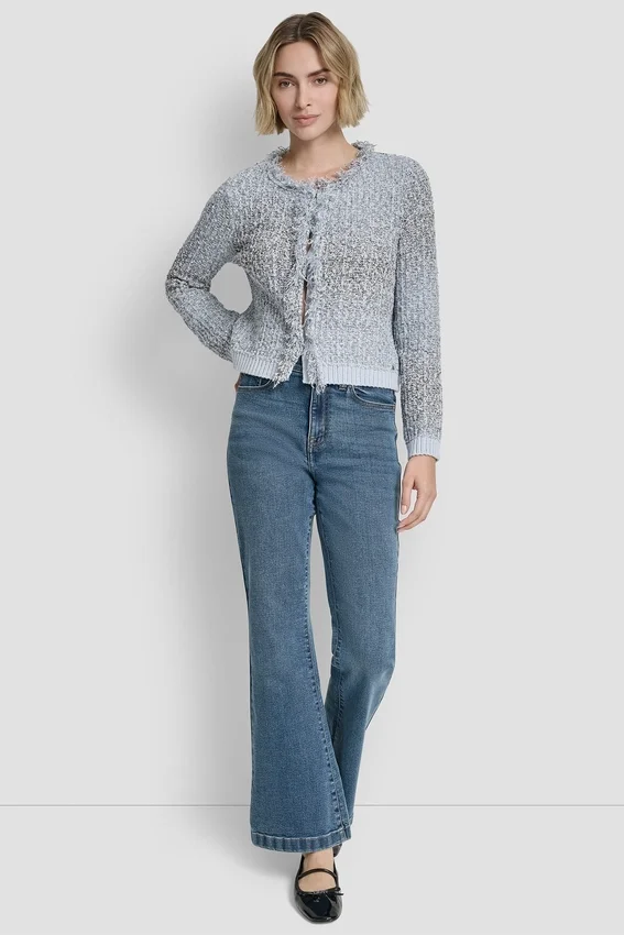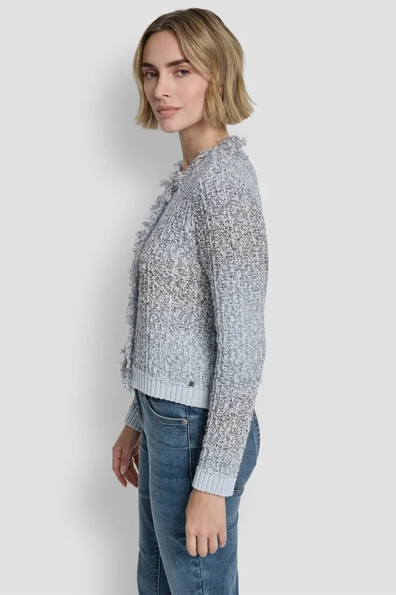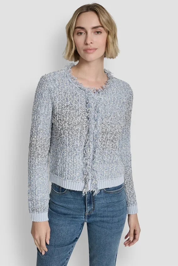 Una prenda elegante inspirada en el tweed, esta chaqueta de jersé con flecos ofrece una versión refinada de la silueta clásica de los cárdigans. Los hilos texturizados y la combinación de colores contrastantes realzan el look con una sutil dimensión.