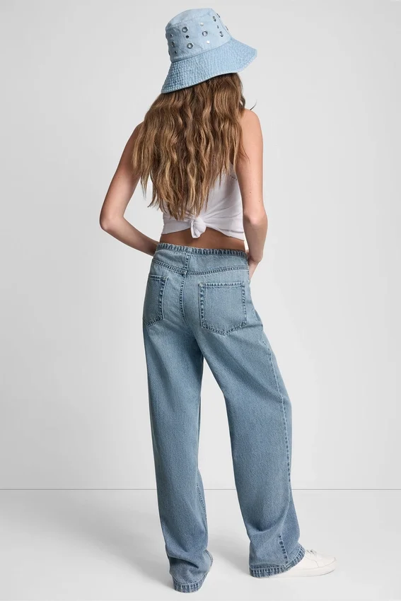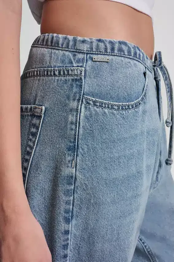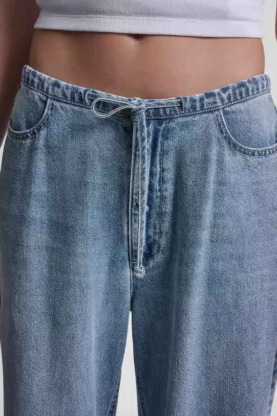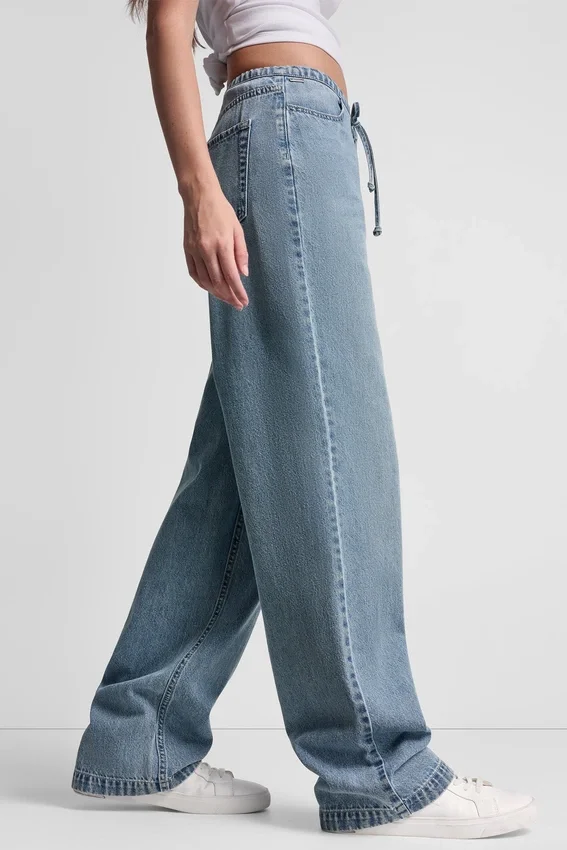 Con un corte holgado y desenfadado, este pantalón de talle medio presenta una silueta de pierna recta y fluida con una cintura con cordones ajustables para mayor comodidad. Confeccionado en denim suave, combina la comodidad informal con la versatilidad para el día a día.