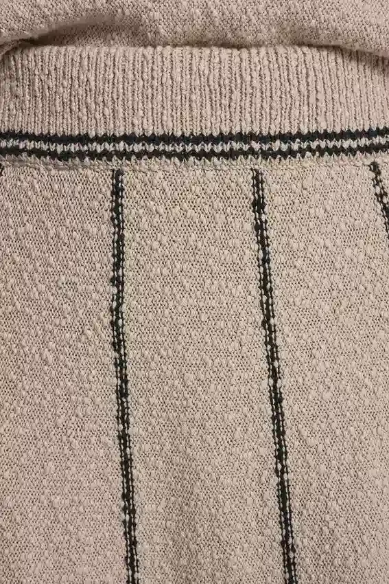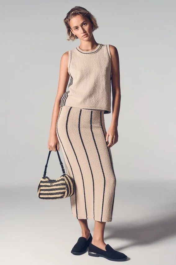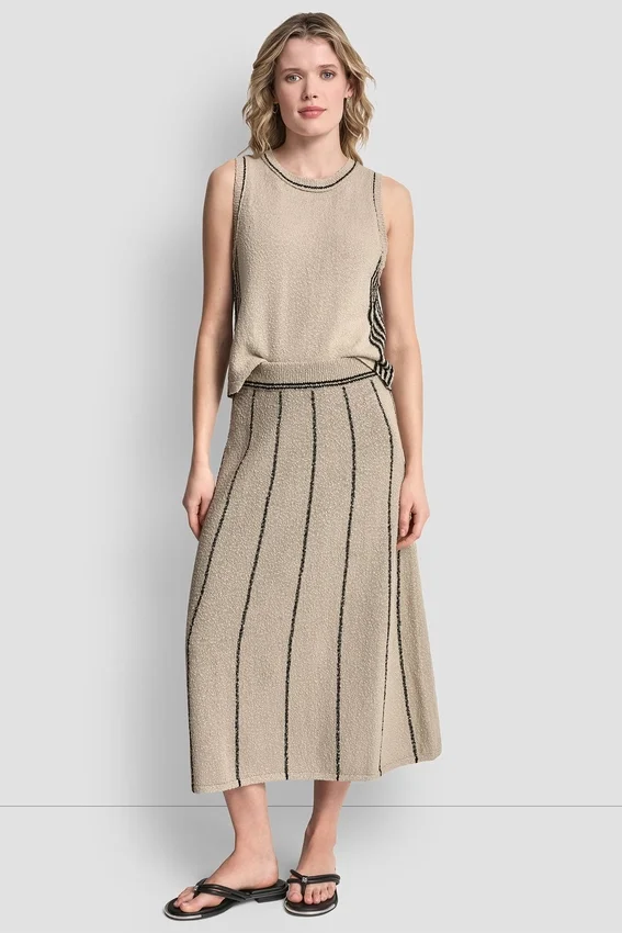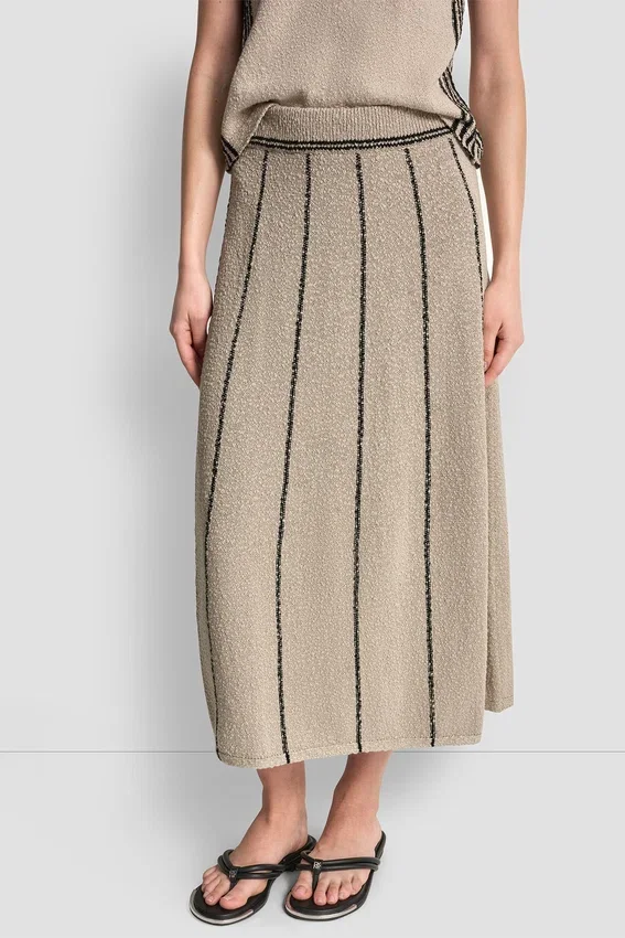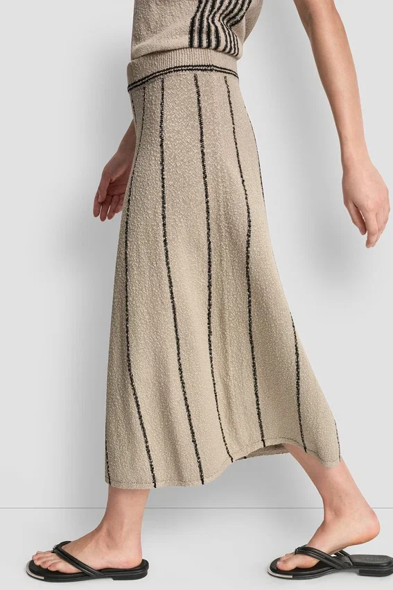 Una falda midi de punto desenfadada que aporta un toque elegante y sencillo a tu vestuario diario. Diseñada con rayas atemporales y una silueta fluida sin cremallera, esta falda de mezcla de algodón te permite moverte con comodidad a la vez que mantiene tu look estilizado y moderno.