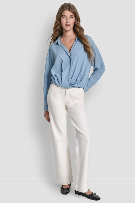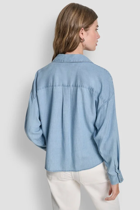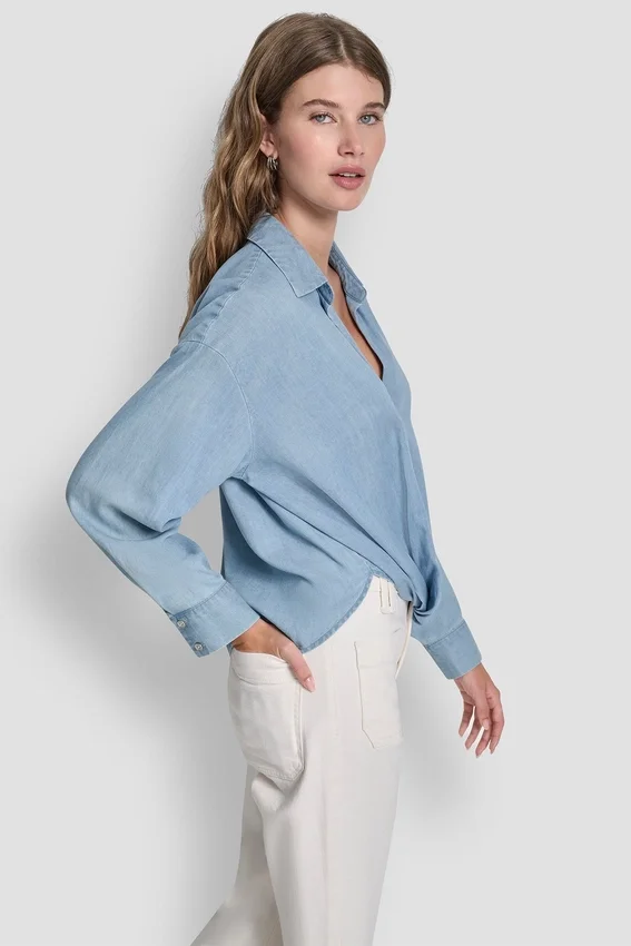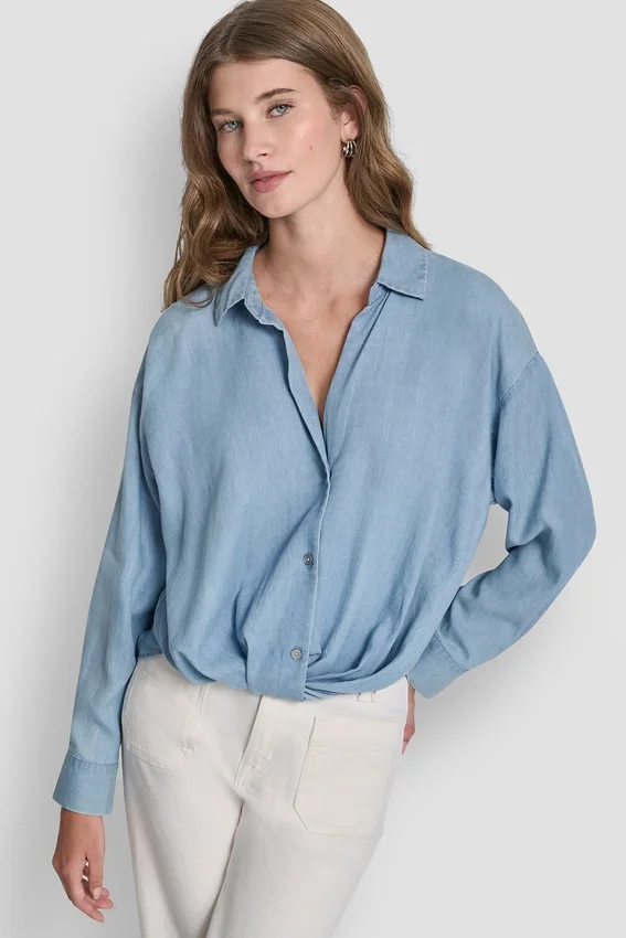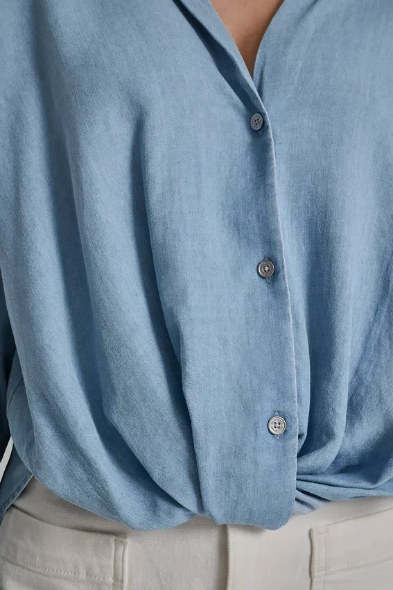 Esta camisa de manga larga con botones en el frente, de aspecto impecable sin esfuerzo, está confeccionada en suave Tencel para ofrecer una caída fluida y un brillo sutil. El dobladillo con detalles anudados le da un toque contemporáneo a la silueta clásica con cuello, lo que la hace perfecta para combinar con otras prendas o para usar sola.