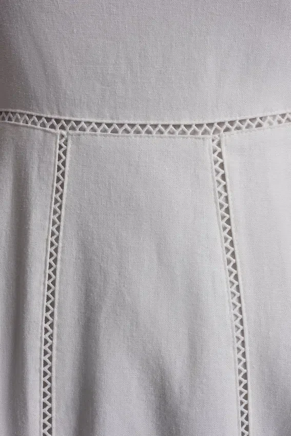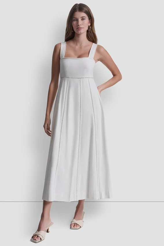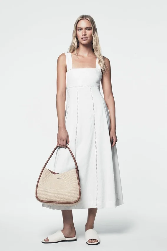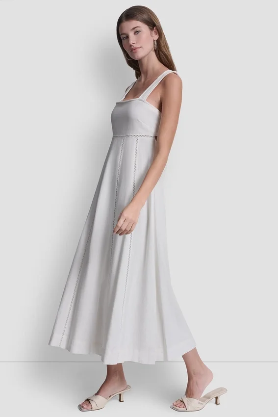 Femenino y transpirable, este vestido sin mangas con costuras está confeccionado en una mezcla de lino y rayón, y cuenta con un favorecedor escote cuadrado y un detalle de lazo en la espalda que le aporta un encanto adicional. Su largo midi lo hace perfecto para ocasiones en climas cálidos.