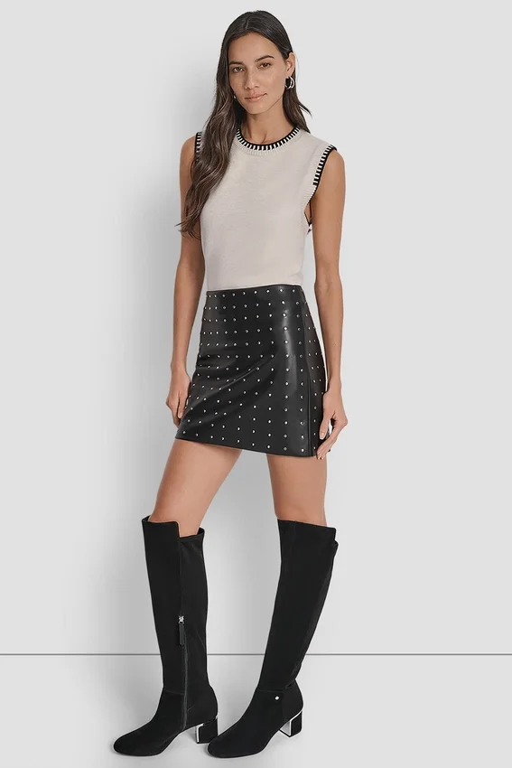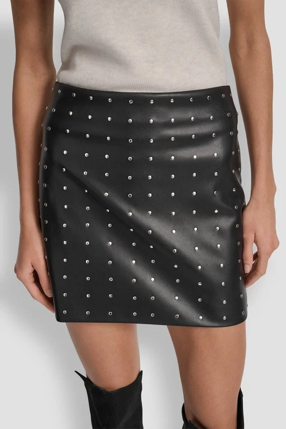 Atrevida pero refinada, esta minifalda de imitación de cuero con adornos está diseñada para destacar sin perder su estilo elegante y moderno.