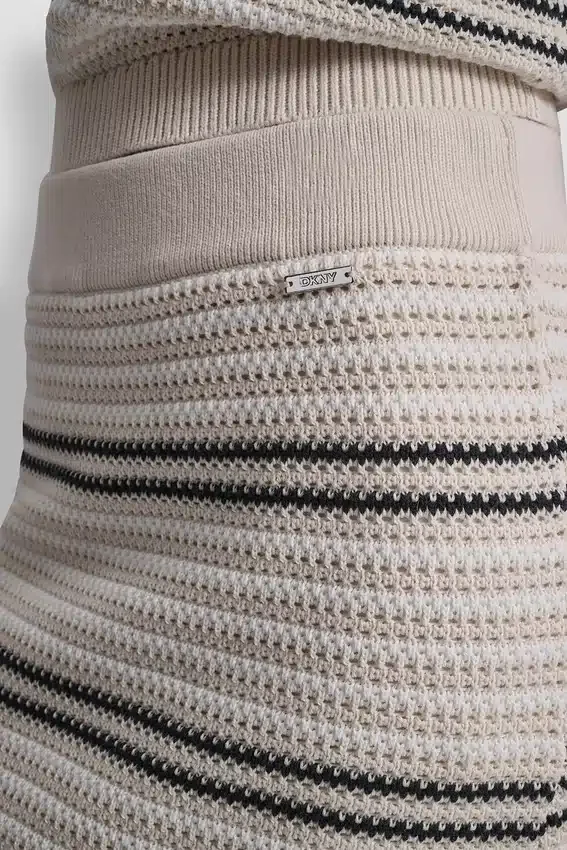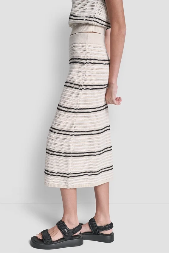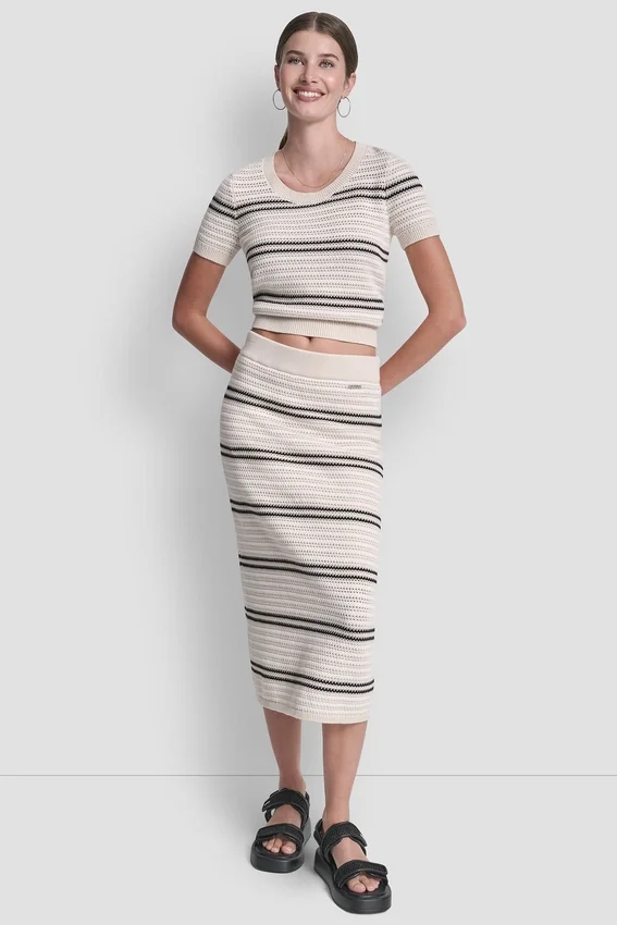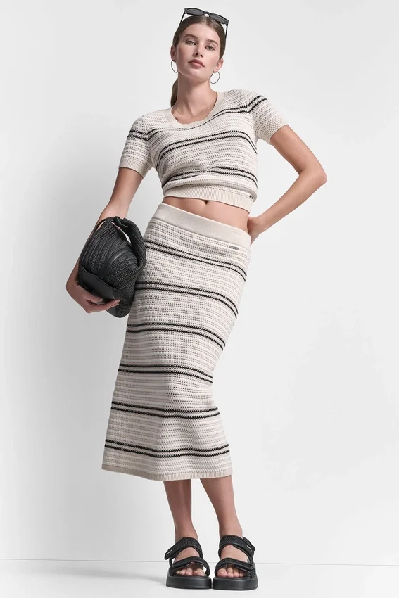 Elegante y femenina, esta falda midi a rayas presenta delicados detalles de costuras de punto calado y una silueta entallada y estilizada. Rematada con un sutil detalle de barra con el logotipo, es una prenda refinada perfecta para crear conjuntos coordinados o para llevar a diario con un toque sofisticado.