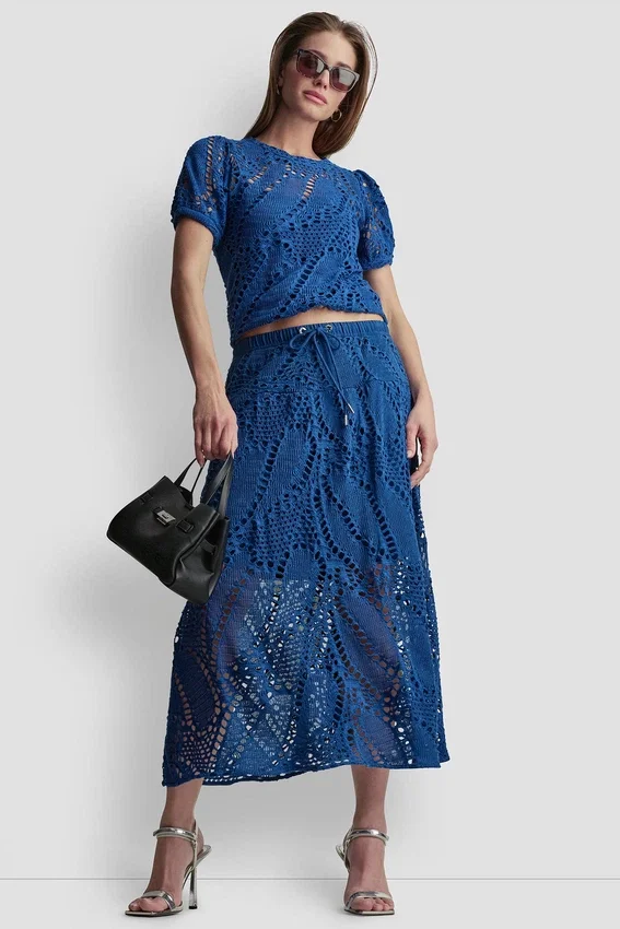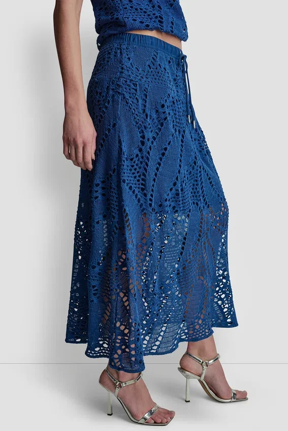 Cuando tus planes para los días cálidos exigen comodidad a propósito, esta falda midi de ganchillo con estampado de hojas te ofrece un look fluido y versátil; solo tienes que combinarla con un jerséu de punto abierto.