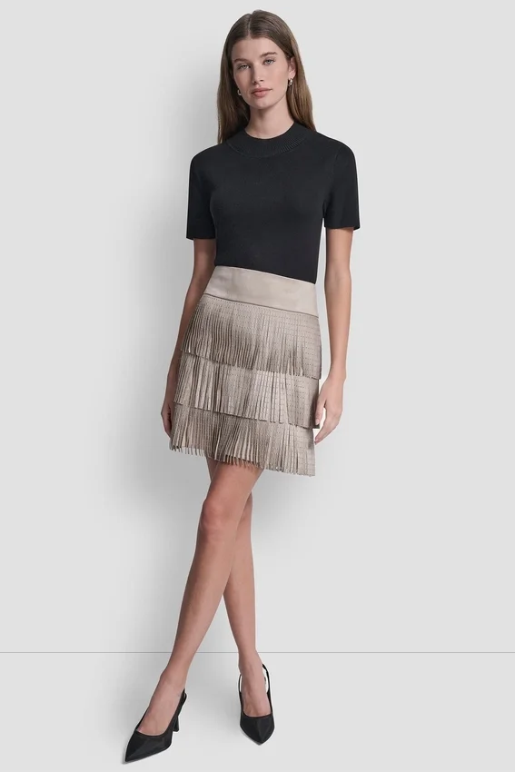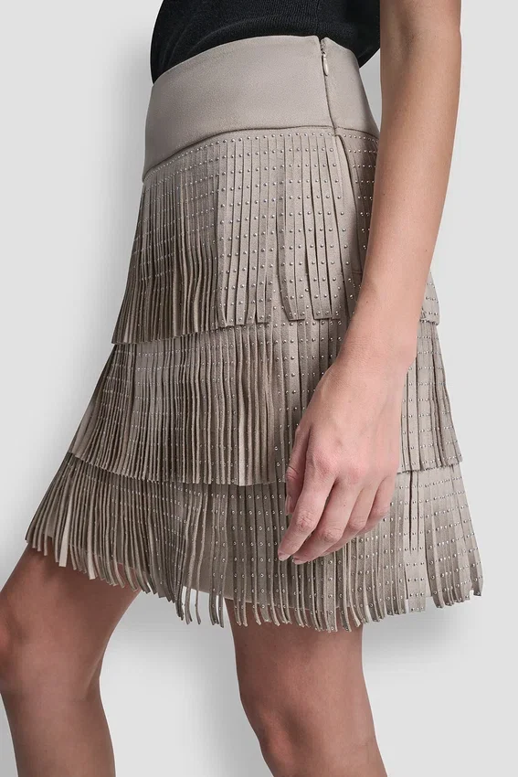 - Minifalda acampanada con flecos y tachuelas