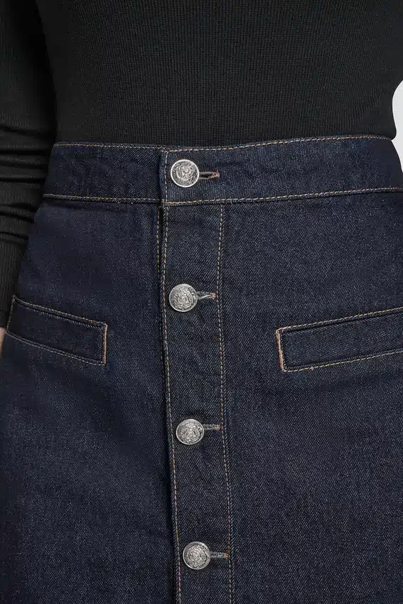 Una minifalda elegante y versátil confeccionada en denim de algodón de tacto fresco. Diseñada con talle alto y una tapeta frontal con botones, cuenta con sutiles detalles de bolsillos ribeteados para un acabado a medida.