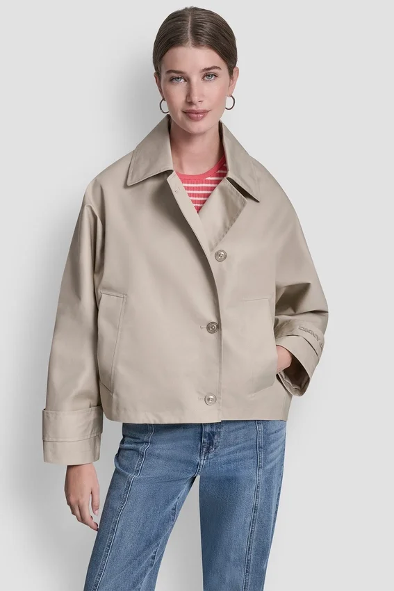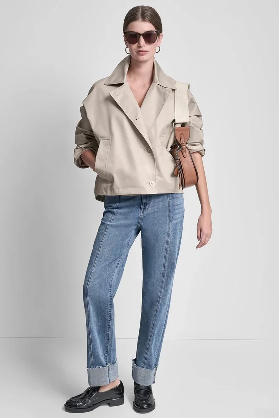 Una versión moderna de la clásica gabardina militar, esta chaqueta corta de un solo pecho cuenta con mangas dolman y una silueta estructurada para un estilo elegante y desenfadado con versatilidad para el día a día.