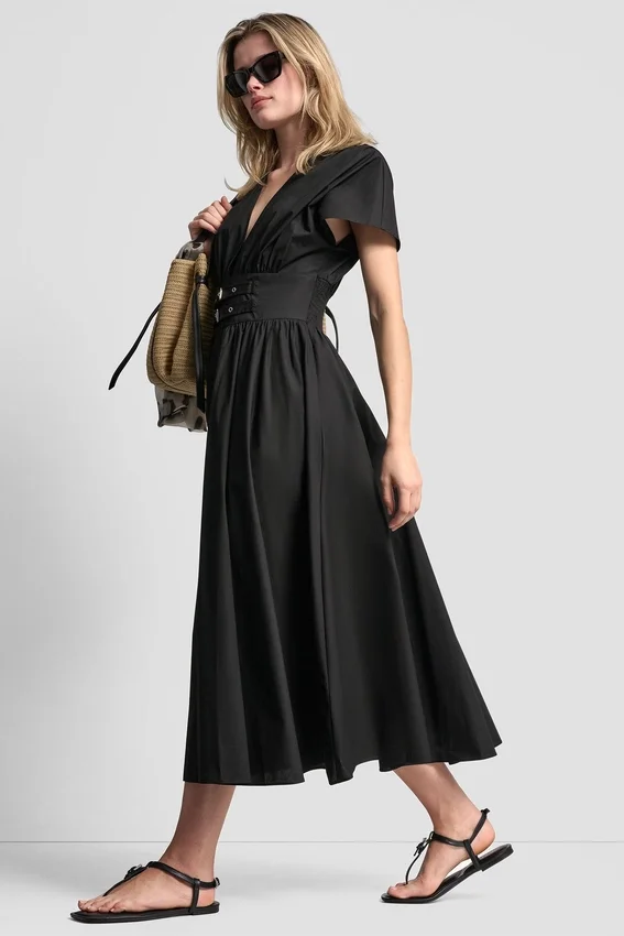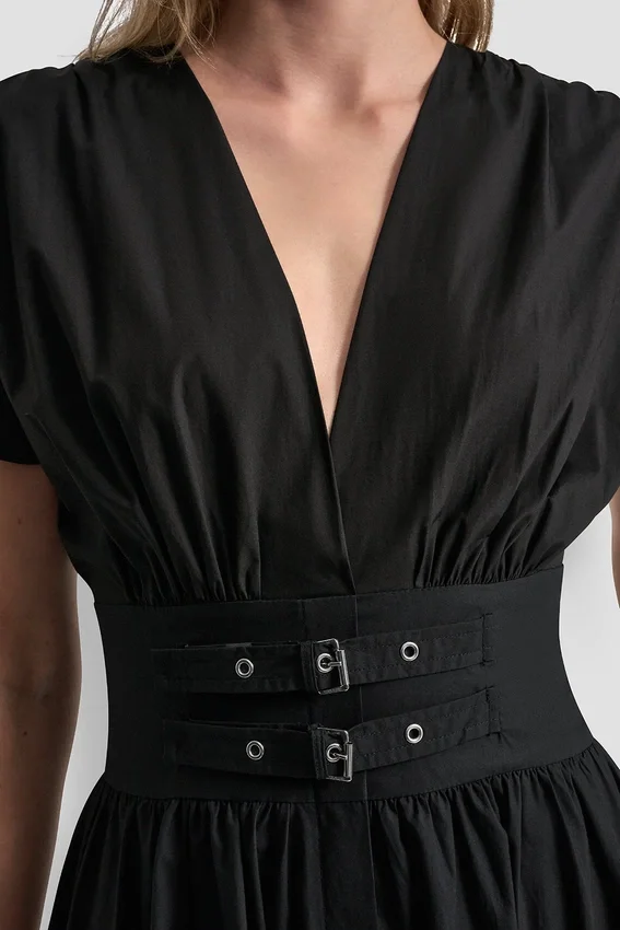 El popelín impecable se une a una estructura moderna en este vestido midi con cintura fruncida. Diseñado con un favorecedor escote en V y rematado con detalles de hebillas en la cintura, equilibra la elegancia de la sastrería con una comodidad sin esfuerzo para un estilo que va del día a la noche.