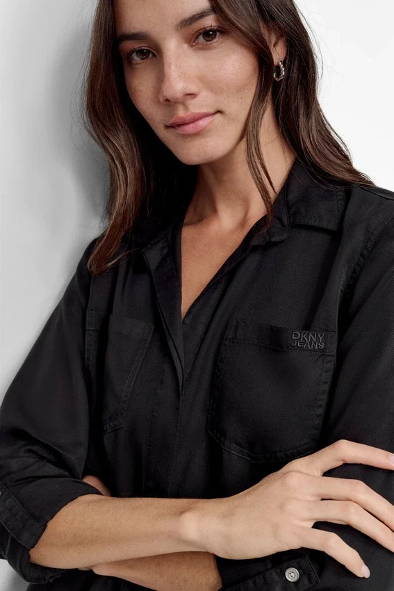 Camisa de mangas largas con lengüetas de botones, cuello en V abierto y espalda abierta. Cierre oculto con botones. Sin forro. Dos bolsillos de parche en el pecho. Popelín Tencel™: 100 % Tencel. Lavar a máquina en frío; no limpiar en seco, no usar lejía ni suavizante; secar en secadora a baja temperatura. Importada. Estilo n.º: Dj4W2017