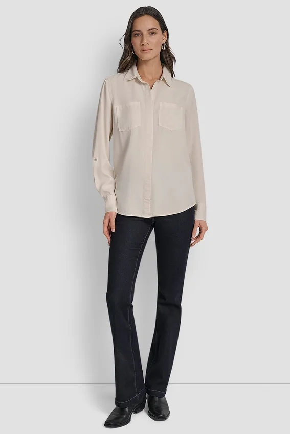 Camisa de mangas largas con lengüetas de botones, cuello en V abierto y espalda abierta. Cierre oculto con botones. Sin forro. Dos bolsillos de parche en el pecho. Popelín Tencel™: 100 % Tencel. Lavar a máquina en frío; no limpiar en seco, no usar lejía ni suavizante; secar en secadora a baja temperatura. Importada. Estilo n.º: Dj4W2017