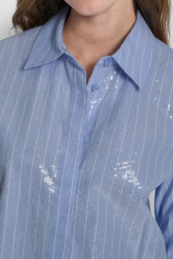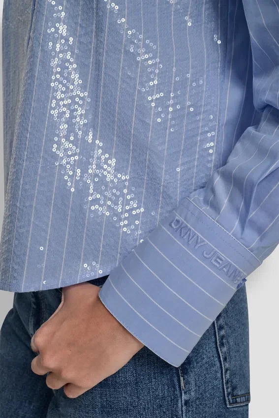 Una camisa de popelín impecable realzada con brillo: diseñada con un logotipo bordado y detalles de lentejuelas en la parte delantera que aportan un toque refinado a la silueta clásica de la camisa con botones. Versátil, elegante y fácil de combinar con jeans o pantalones de sastrería.