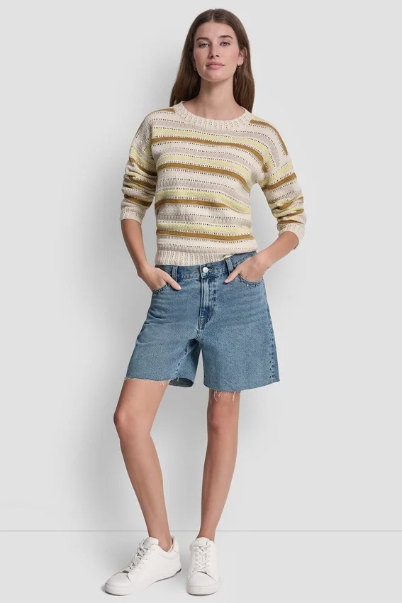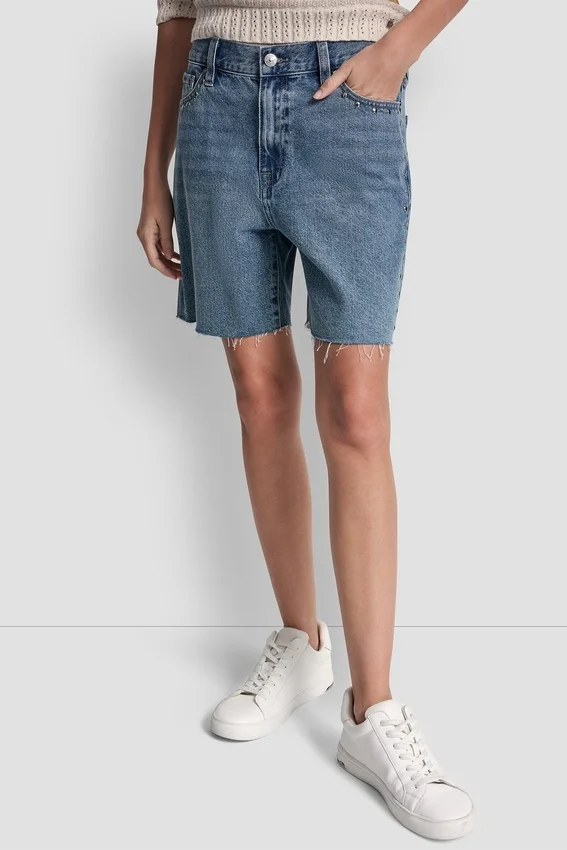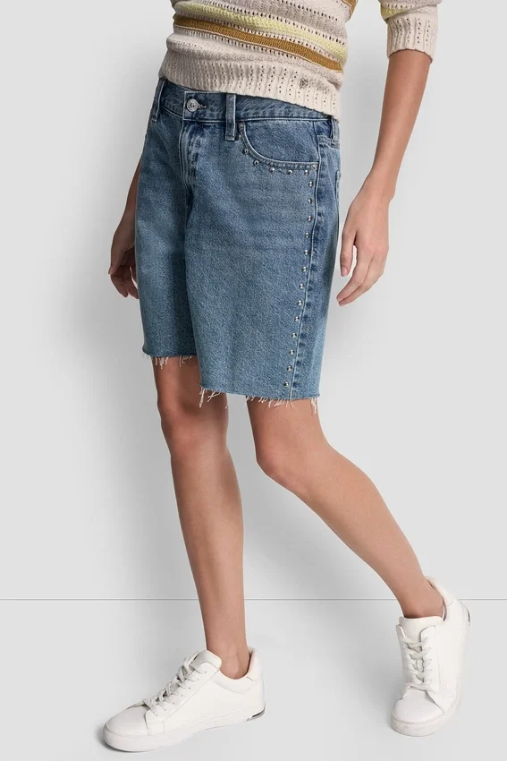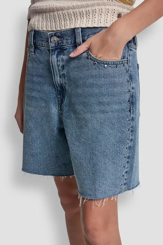 Una versión moderna del denim clásico, estos pantalones cortos de talle medio y corte holgado cuentan con adornos de tachuelas abombadas para un toque sofisticado. Diseñados con un lavado de tono medio y un cómodo corte holgado, son perfectos para un estilo cotidiano sin complicaciones.