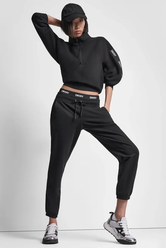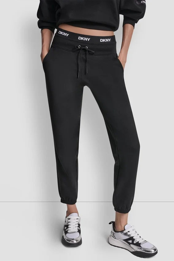 - Pantalones jogger de talle alto con logo en la cintura y aberturas elásticas en las piernas