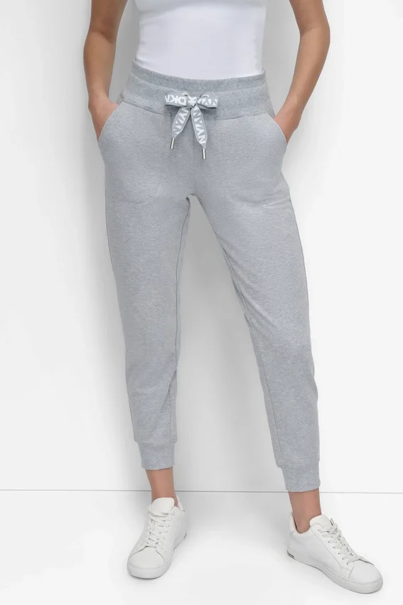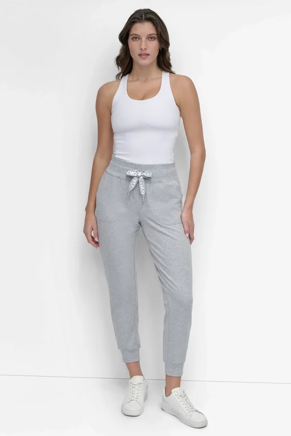 Pantalones Jogger ajustados de talle alto con cordón y logo bicolor; Bolsillos diagonales en las caderas; Se pone por la parte de arriba, con cintura elástica con cordón; Sin forro; Jersey francés de mezcla de algodón: 95 % algodón, 5 % spandex; Lavar a máquina en frío del revés; No usar lejía ni suavizante; Secar en secadora a baja temperatura; Importado; N.º de estilo: Dp5P3496
